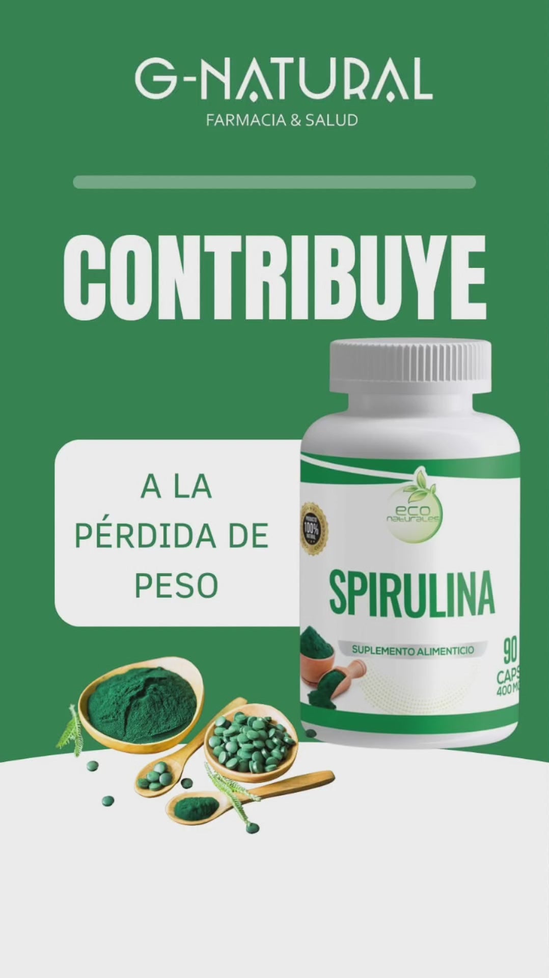 Spirulina Plus está disponible en forma de cápsulas, tabletas o polvo. Cada envase contiene una cantidad suficiente para un mes de suplementación diaria, asegurando una ingesta continua y efectiva.